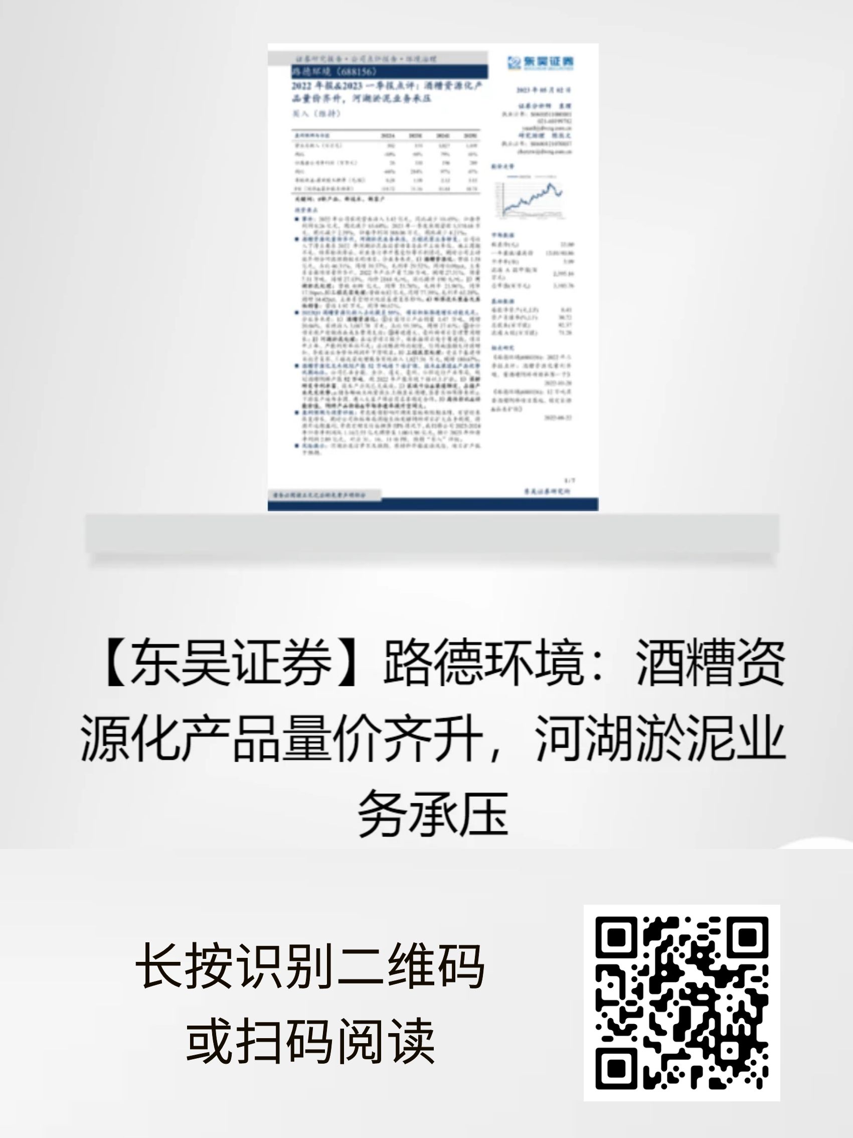 【點(diǎn)評報(bào)告】東吳證券點(diǎn)評路德環(huán)境:酒糟資源化產(chǎn)品量價(jià)齊升,河湖淤泥業(yè)務(wù)承壓